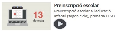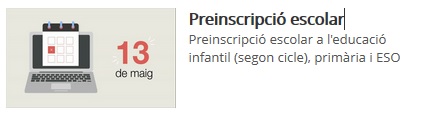 El departament d’educació ha publicat oficialment a la seva web el calendari de preinscripció. La preinscripció escolar per l'educació infantil, primària i ESO serà entre el 13 i el 22 de maig. Es podrà fer de manera telemàtica i no presencial des del dia 13 de maig. Ateses les actuals circumstàncies extraordinàries per la covid-19, es podrà fer de forma presencial només amb cita prèvia, entre el 19 i el 22 de maig.