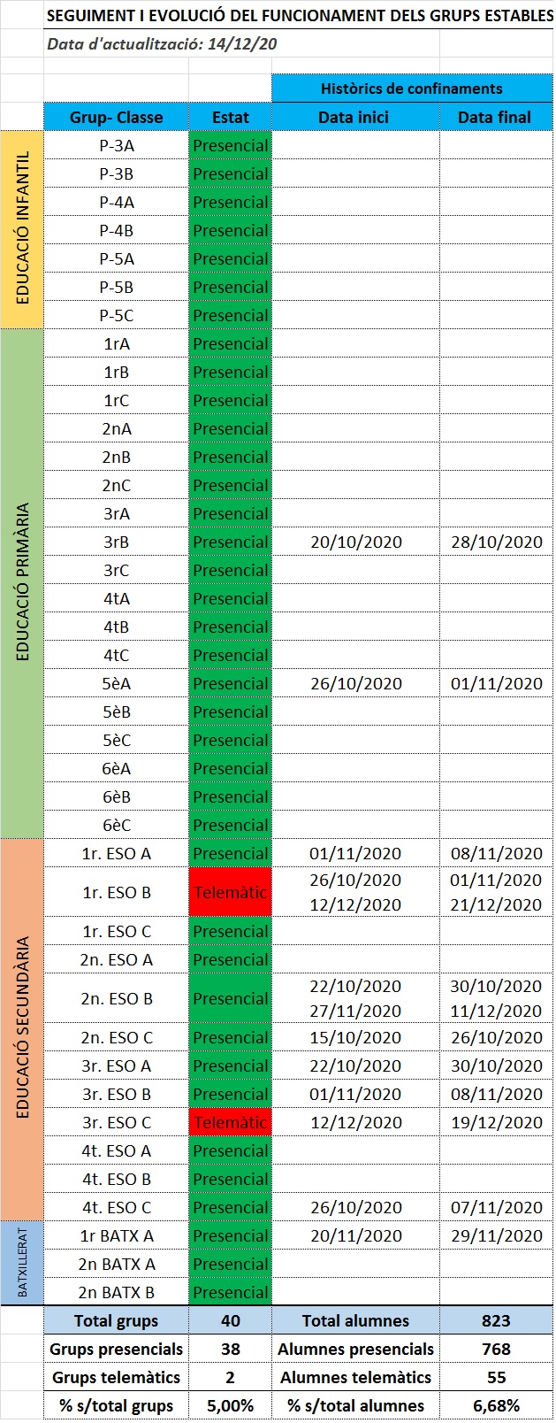 - Amb l’objectiu de reduir al màxim possible la ràtio per aula en el nostre centre hem decidit desdoblar també els cursos de P5 d’infantil, 1r i 2n de primària. D’aquesta forma des de P5 d’infantil fins a 4rt d’ESO tots els cursos quedaran distribuïts en 3 grups.
